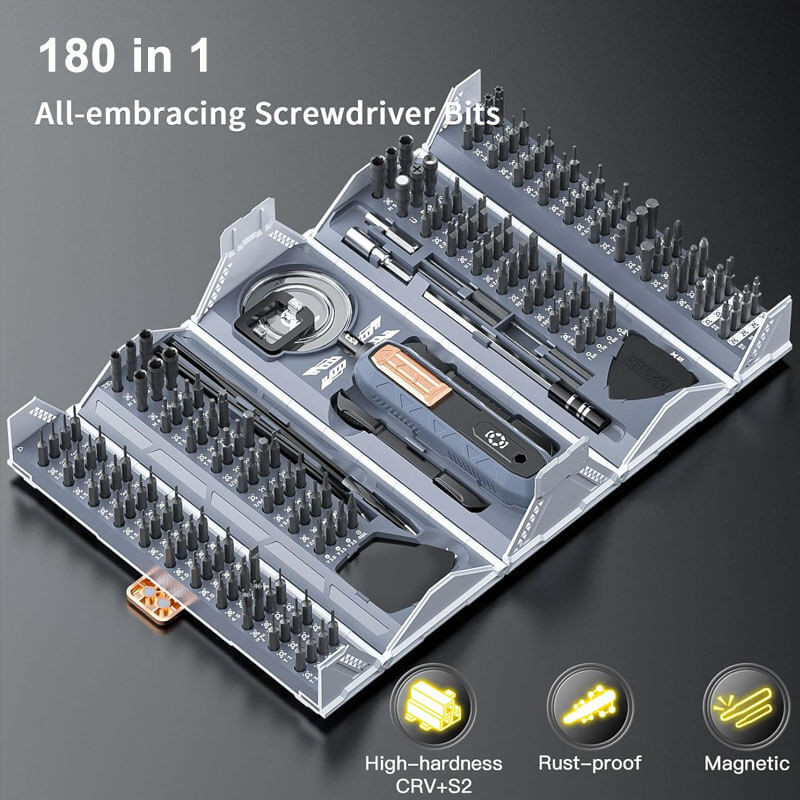 Egal ob Heimwerker oder professioneller Techniker, das 180-in-1-Präzisionsschraubendreher-Set ist ein Muss in Ihrem Werkzeugkasten. Es ist Ihr perfekter Begleiter für eine Vielzahl von Reparatur- und Wartungsarbeiten. Nie wieder nach dem richtigen Werkzeug suchen – hier finden Sie alles!