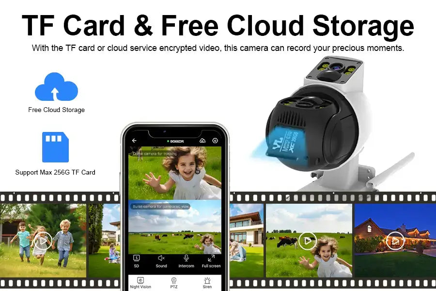 Sie können Ereignisaufzeichnungen wahlweise auf einer SD-Karte (kostenlose 32 GB) oder im Cloud-Speicher speichern, wo sie immer sicher und leicht zugänglich sind.