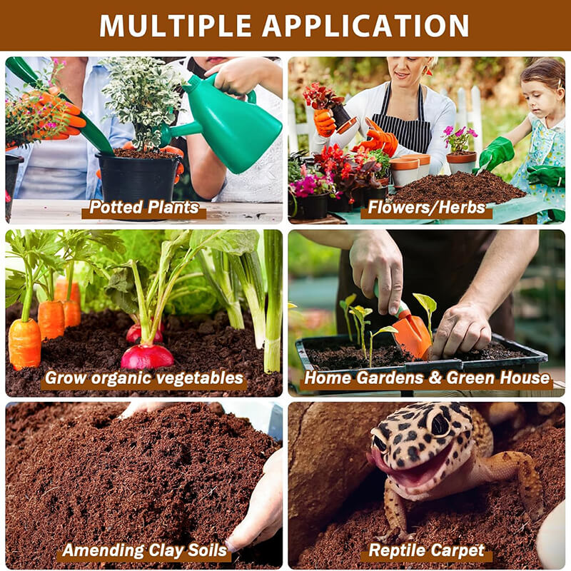 Kokosfaser eignet sich für den Anbau verschiedener Pflanzen wie Blumen, Sukkulenten, Gemüse, Kräuter und mehr. Sie kann auch zum Eintopfen, zur Wurmkompostierung, als Reptilienbeet, für Blumenbeete und Pflanzsäcke verwendet werden und erfreut sich bei Gartenbauern großer Beliebtheit.
