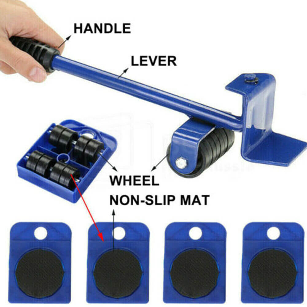 t is absolutely the first consideration to ensure that the furniture and floor are not damaged. The furniture lifting crowbar is made of durable steel, coated with PVC handles, and has a non-slip design. The surface of the 4 sliding rails is made of sturdy ABS plastic, which will not damage the furniture. Each slide is inlaid with 4 universal wheels, a total of 16 universal wheels, flexible and durable, and rubber wheels will not damage the floor.