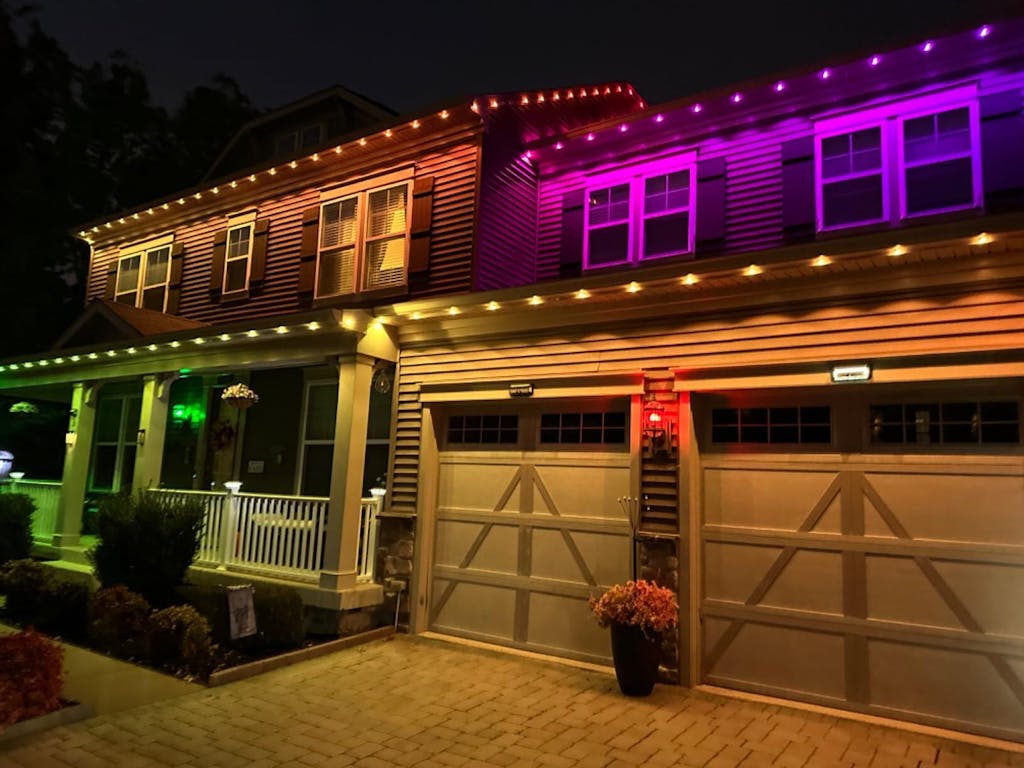 An APP can control different sets of permanent lights in different areas, personalize your lighting range and effect. We can also customize your outdoor light layout for you based on the perimeter of your house, so feel free to contact us if you need help.