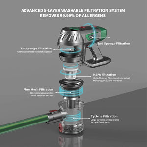 With high-density HEPA that removes up to 99.99% of tiny dust particles as small as 0.1 microns, this vacuum cleaner provides every user with ultimate purified air and a superior cleaning experience. Equipped with 1500ml large capacity dust box. Washable, recyclable HEPA filters are durable and easy to clean.