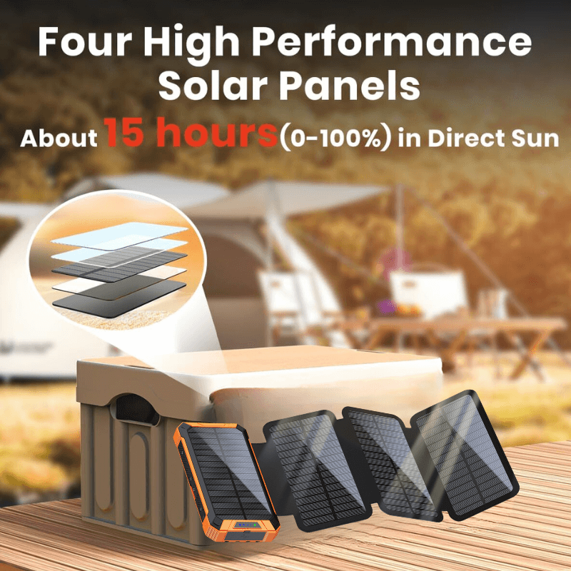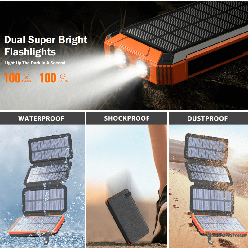 El banco de energía solar iToolMax tiene una gran capacidad de batería de 27000 mAh y 4 paneles solares generan electricidad , lo que puede brindarle un suministro de energía ilimitado sin costo de electricidad.