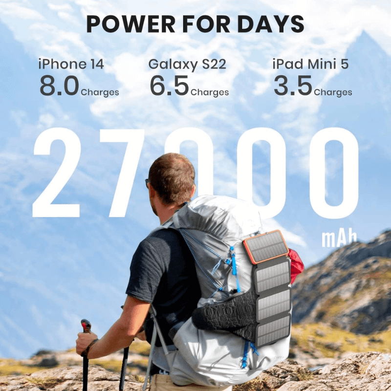 This thing is the Swiss Army knife of power banks. Not only does the 27,000 mAh battery charge most modern phones 3-4 times, this thing literally charges itself. It's got 4 small solar panels that fold nicely on top, so when camping you don't need electricity to recharge it. There are small indicator lights that come on almost immediately when opening up the panels so you know it's charging.