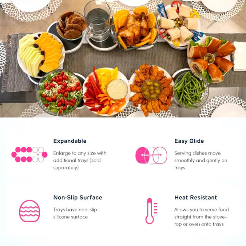 Base estable de material ABS con gran capacidad de carga, que permite colocar una variedad de vajillas y recipientes. La superficie de silicona es duradera y resistente a altas temperaturas, lo que facilita su transporte del horno a la mesa. Su superficie antideslizante mantiene los artículos en su lugar.