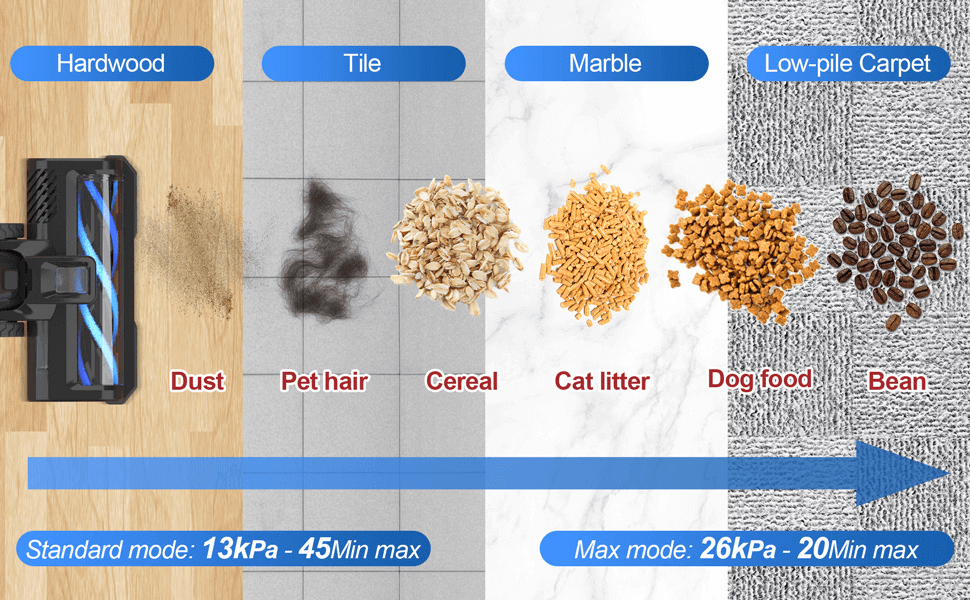 I have tile floors in my house and my regular vacuum is made for more carpet cleaning. So I purchased this one I love that it is cordless. I also have a cat and a litter box so it’s super easy to just turn on and get all the litter. I will say that make sure it is fully charged I do have a 2000 square-foot house and the battery will last only until you’re almost done. The battery goes pretty fast. There is only to settings slow and fast. It is on the quieter side which is awesome. It does not scare my cat as much. I love that there is a little light so in places you cannot see you don’t miss any debris. I have also used it on my area rug in the living room and it does pick up the basics. I have also use it in the bedrooms on the regular carpet and I won’t say that it deep cleans, but it does pick up the majority. It does come with extra filters which was really nice and it is very light weight.