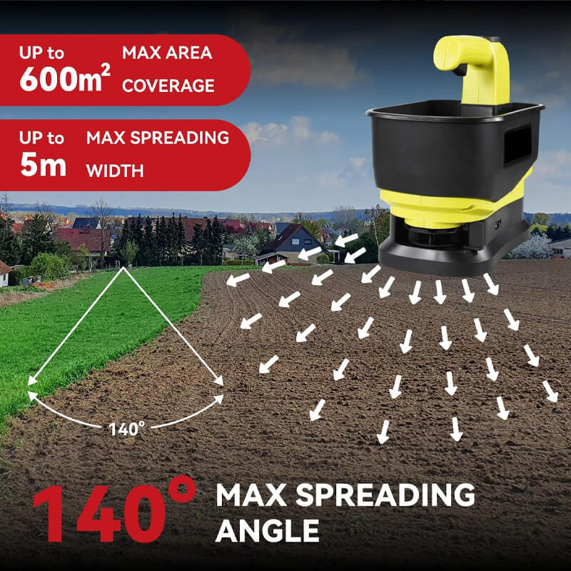 Up to 140° allows you to control the spread width, up to 600㎡/6458sq.ft coverage area, spreading up to 5m/16.4ft with even and precision. This feature offers ultimate flexibility, you can easily control the spreading angle and amount to meet your needs, making your gardening tasks more efficient and customizable.