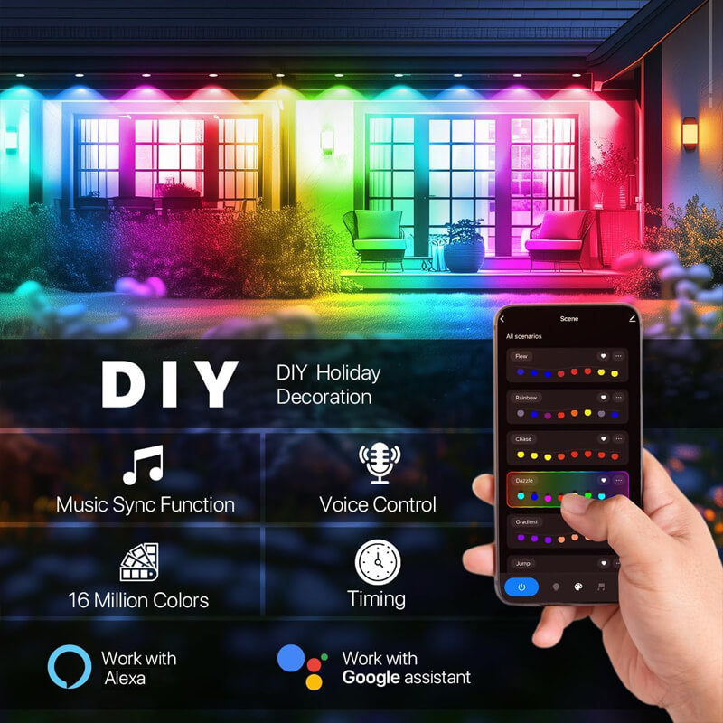 An APP can control different sets of permanent lights in different areas, personalize your lighting range and effect. We can also customize your outdoor light layout for you based on the perimeter of your house, so feel free to contact us if you need help.