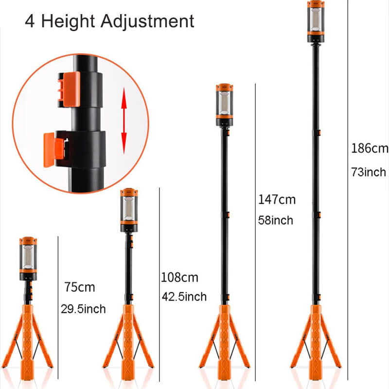 The height of the telescoping tripod light can be adjusted from 29"(73cm) to 74"(185cm) by 3 adjustable buckles on the main pole. Only 21"(53cm) long after folding, well fit into car trunk or lean against the wall.