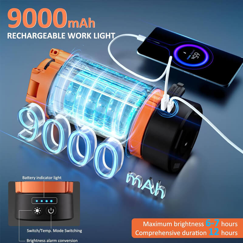 Our camping light can be also used as a powerbank to charge your phone and other rechargeable tools. And work for 12 Hours of continuous use under full charged.